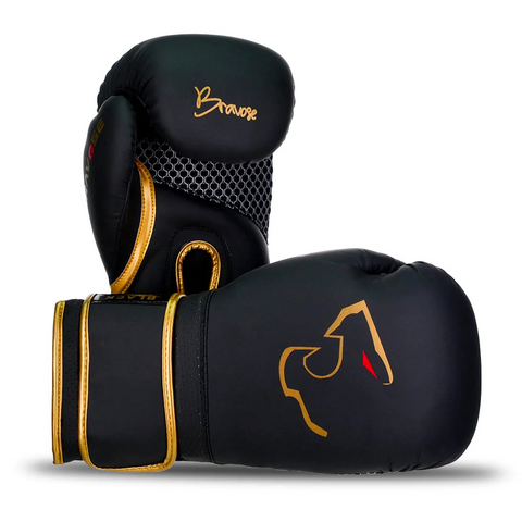 Exude mystery, power, elegance, and sophistication with the Bravose Black boxing gloves. Crafted from PU synthetic leather, the hook and loop Velcro strap will give a super snug fit while the advanced padding and soft lining cushion the fists, thumbs and wrists from heavy impact. The PU synthetic leather is designed to be as tough as you are, and boasts an eye-catching matte black finish with gold trim.