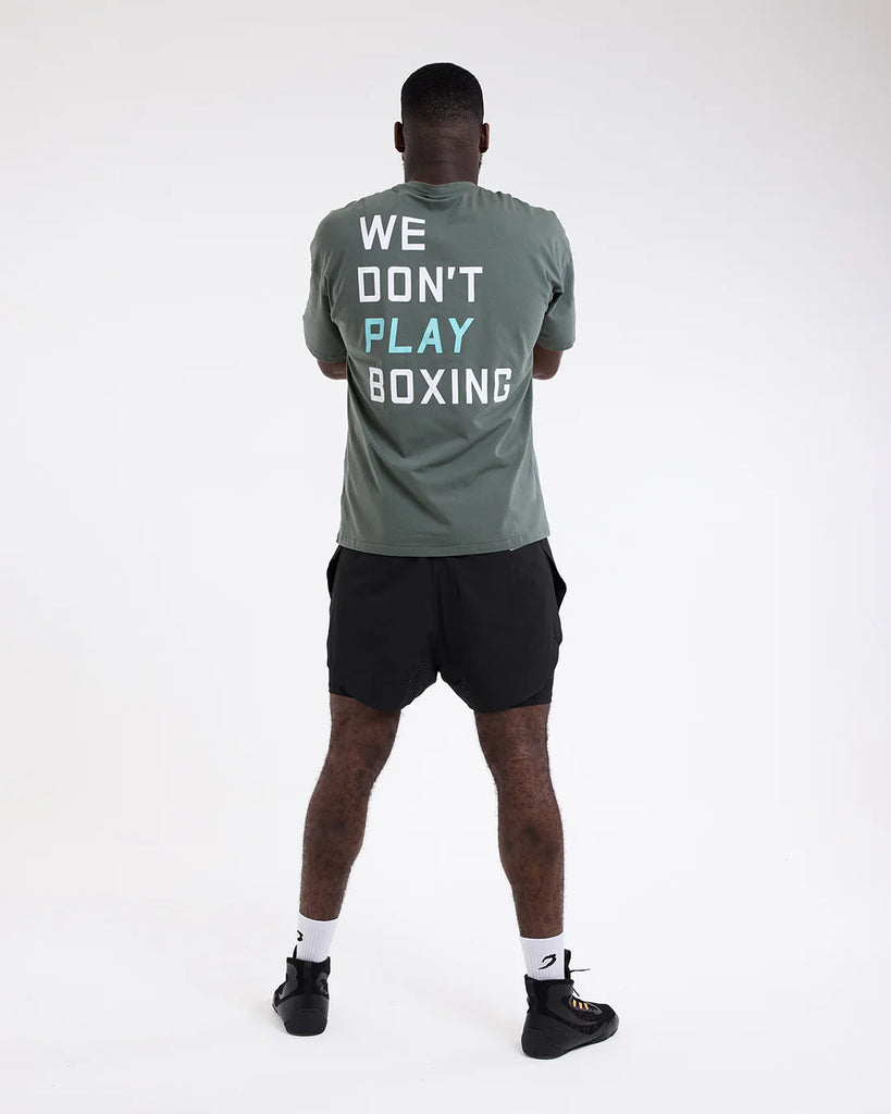 This oversized stretch cotton tee shirt offers the perfect balance of breathability, structure and flow to accompany you through the rounds, round after round. Featuring our signature WE DON'T PLAY BOXING® slogan across the back, this traing tee serves to remind the world of a well-known fact within our community: You can play football, you can play basketball and you can play baseball but, you can't play boxing.