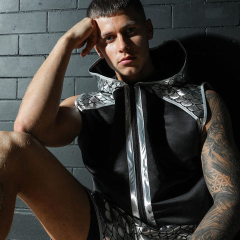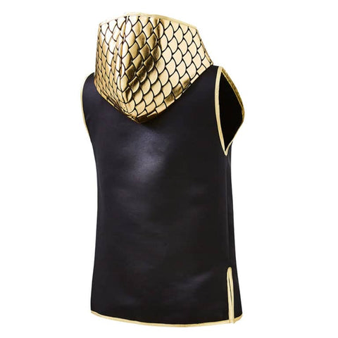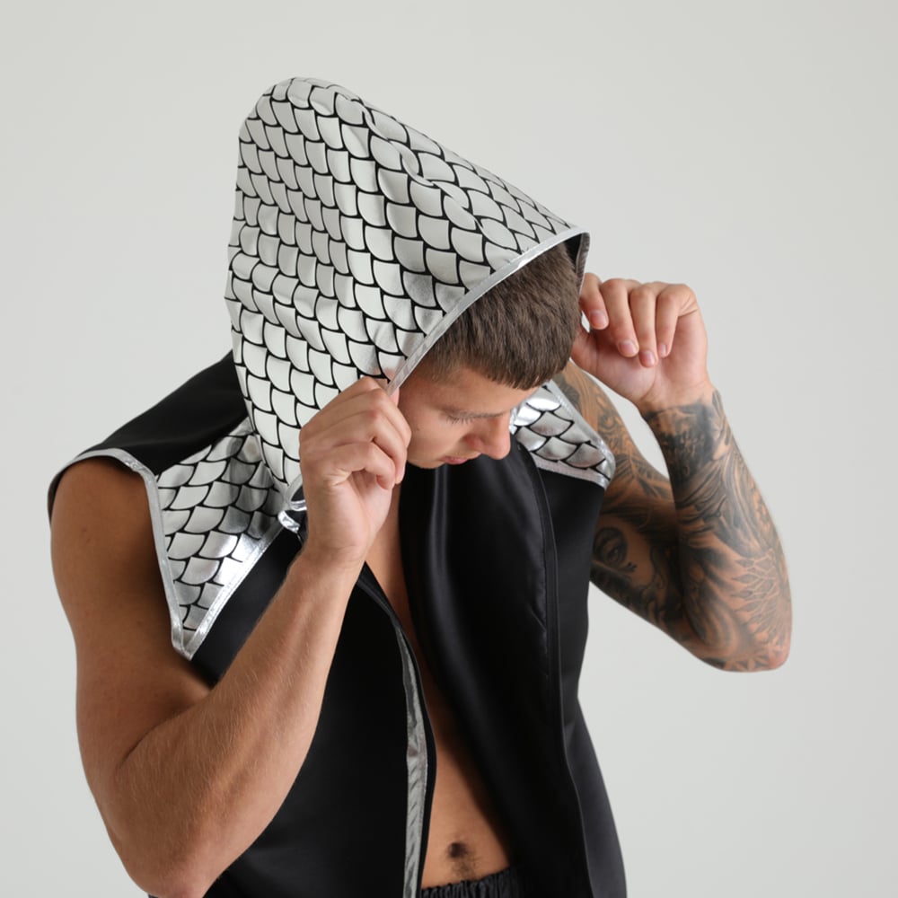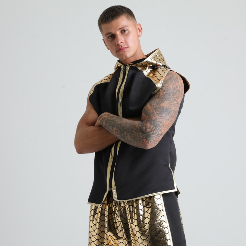 Luxury boxing fight wear at its finest. Stand out from the crowd and sparkle in the ring. Stand out in our eye-catching Suzi Wong Fish Scale Shine Boxing Ring Jacket. This satin boxing ring jacket has a foiled scaled patterned fabric to the shoulders and outer hood.