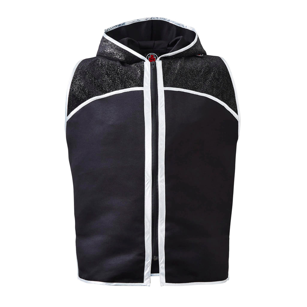 Luxury boxing fight wear at its finest. Stand out from the crowd and sparkle in the ring. This kids black satin boxing ring jacket has black sparkle velvet to the upper shoulders and outer hood. The jacket is trimmed in silver.