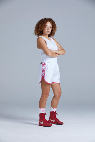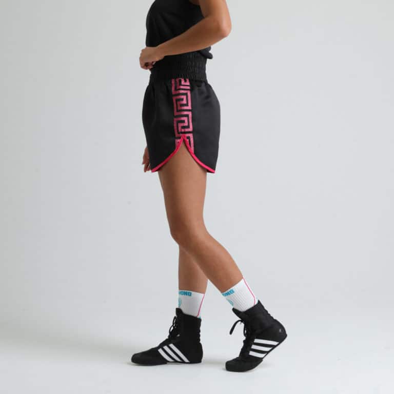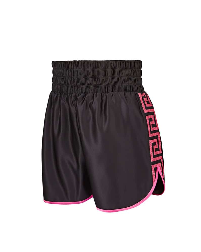 Custom Women’s Fit Boxing Shorts, designed with a shorter length than standard men's boxing shorts. Hand made in the UK with luxury satin and Versace style gold sparkle to the sides. These boxing trunks are perfect for the female amateur or professional fighter. Hit the ring in a brand new style ready to fight in style.