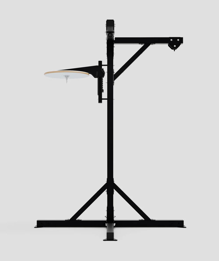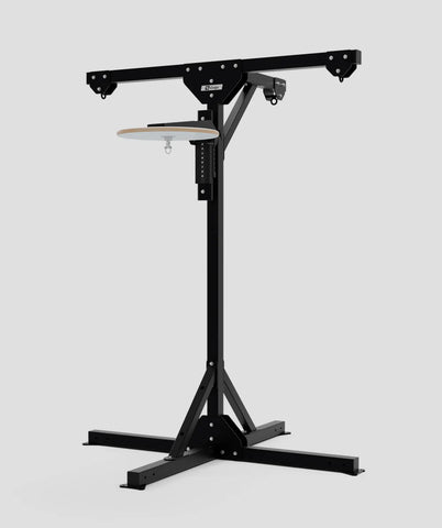 The Exigo 4 Station Bag Frame with Speedball frame features a height adjustable speedball platform with numeric indicators and 3 punchbag arms. This freestanding punchbag frame allows 4 people to train simultaneously and is fully commercial with a main frame lifetime warranty making it a great solution for busy gyms.