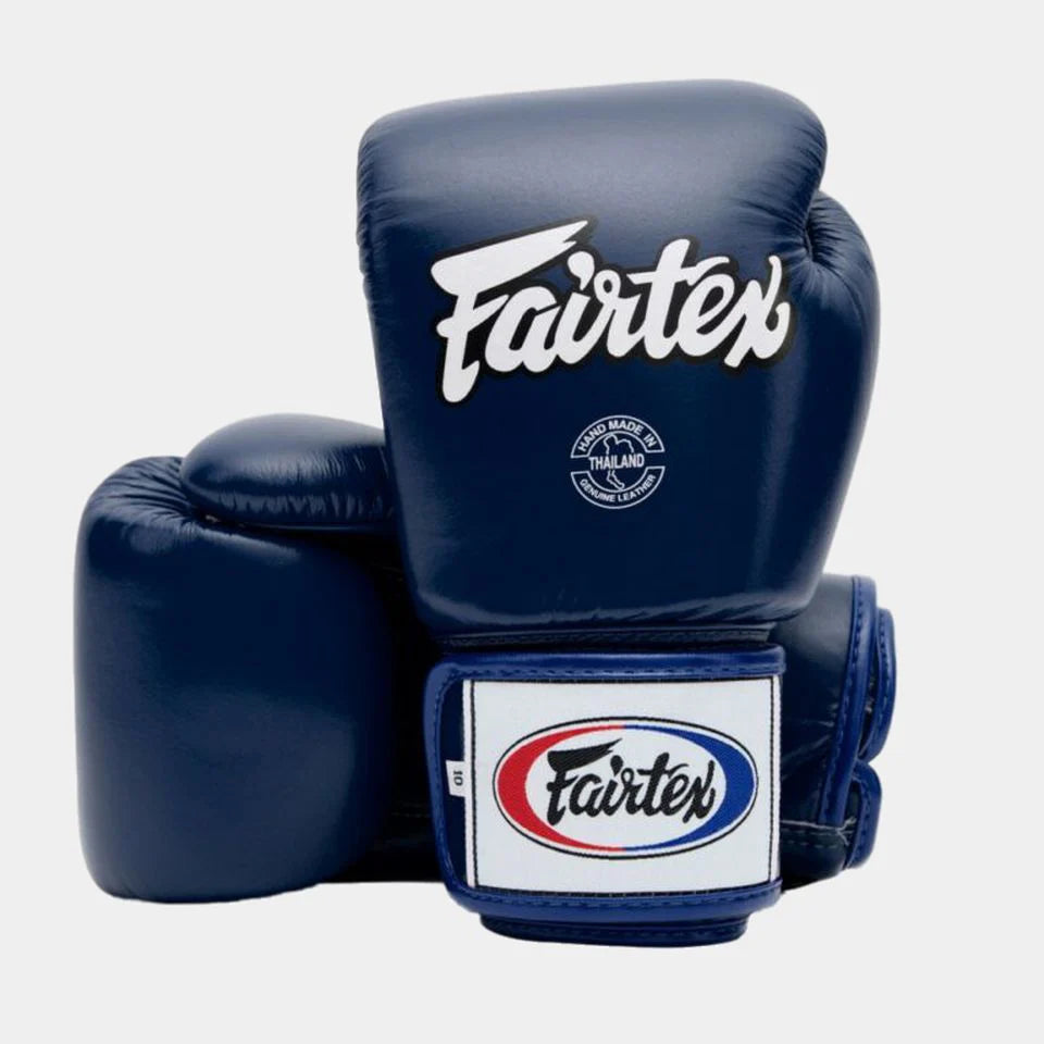Fairtex Universal Muay Thai Gloves. Ergonomically engineered with a unique contoured and tight-fit hand compartment design to provide a secure and snug fit. Constructed of premium quality leather with Fairtex's signature three-layered foam system for excellent hand and knuckle protection and shock disbursement.