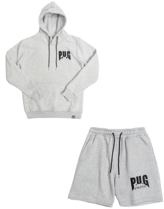 PUG Athletic Fleece Hooded Short Set. Hoodie has large Oblique PUG Boxing logo on back. Training set features: